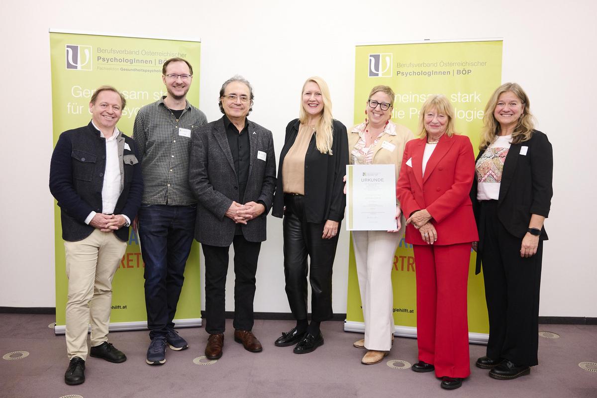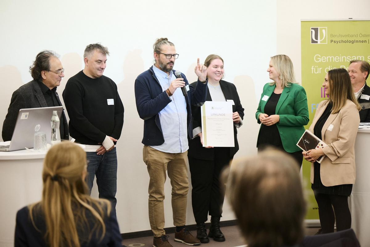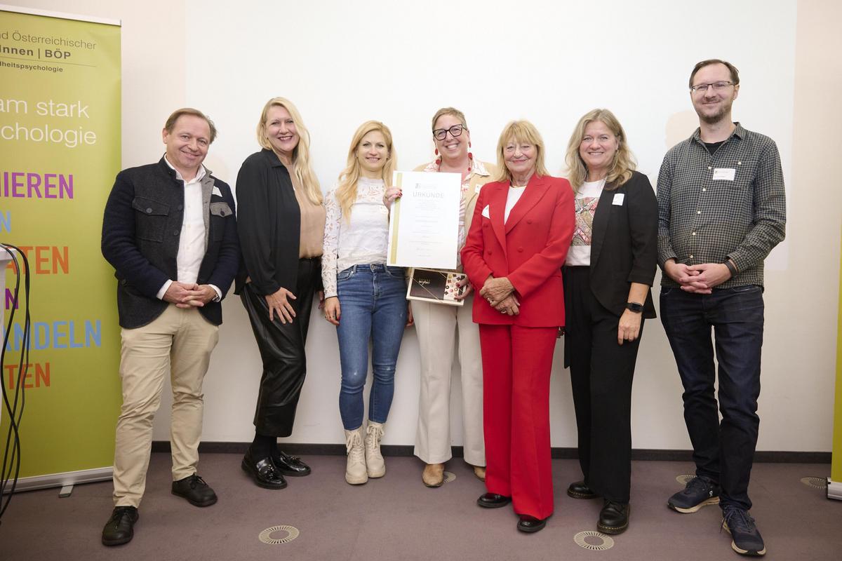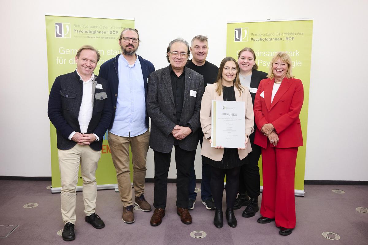 Prof. Mag. Dr. Stefan Höfer nahm die Preisverleihung vor, bei der drei herausragende Projekte ausgezeichnet wurden, die zeigen, wie vielfältig und praxisnah Gesundheitspsychologie in Österreich gelebt wird. Der Preis ging an Golli Marboe und Iris Haschek für das Projekt „Mental Health Days“, an Mag. Paul Brugger-Willomitzer, Mag.a Kathleen Löschke, Theresa Schatzmann, MSc, Mag.a Veronika Schlögl-Reitter, Mag.a Eva Trettler und Mag.a Hilde Wolf, MBA für das Projekt „Durchblicker*in“ sowie an Mag. Birgit König und Mag. Florian Reiterer für das Projekt „#pflegekraft“.