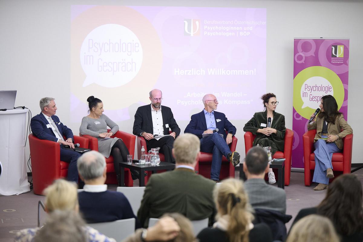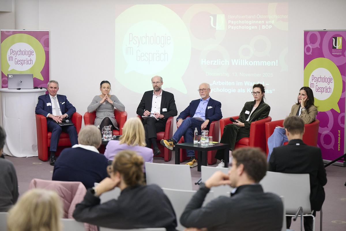 Den rasanten Veränderungen der Arbeitswelt widmete sich am Donnerstag, dem 13. November, die BÖP-Diskussionreihe „Psychologie im Gespräch“. Unter dem Titel „Arbeiten im Wandel – Psychologie als Kompass“ bot der Berufsverband Österreichischer Psychologinnen und Psychologen (BÖP) ein hochkarätig besetztes Podium. Mehr als 600 Personen verfolgten die Diskussion – vor Ort im Seminarzentrum der Österreichischen Akademie für Psychologie | ÖAP und online.